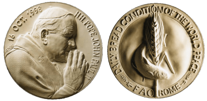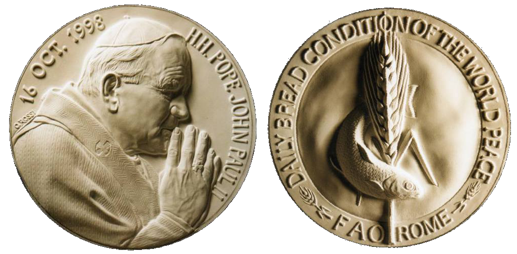 Recto/verso di modelli in gesso per la medaglia di bronzo coniato, realizzata in occasione della Giornata Mondiale dell’Alimentazione. Committente: F.A.O. Food and Agriculture Organization of the United Nations, 1998