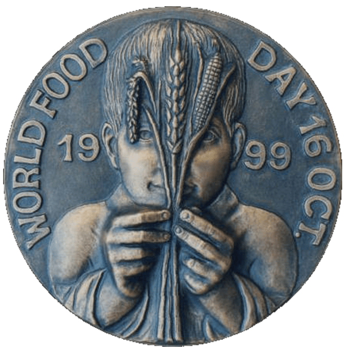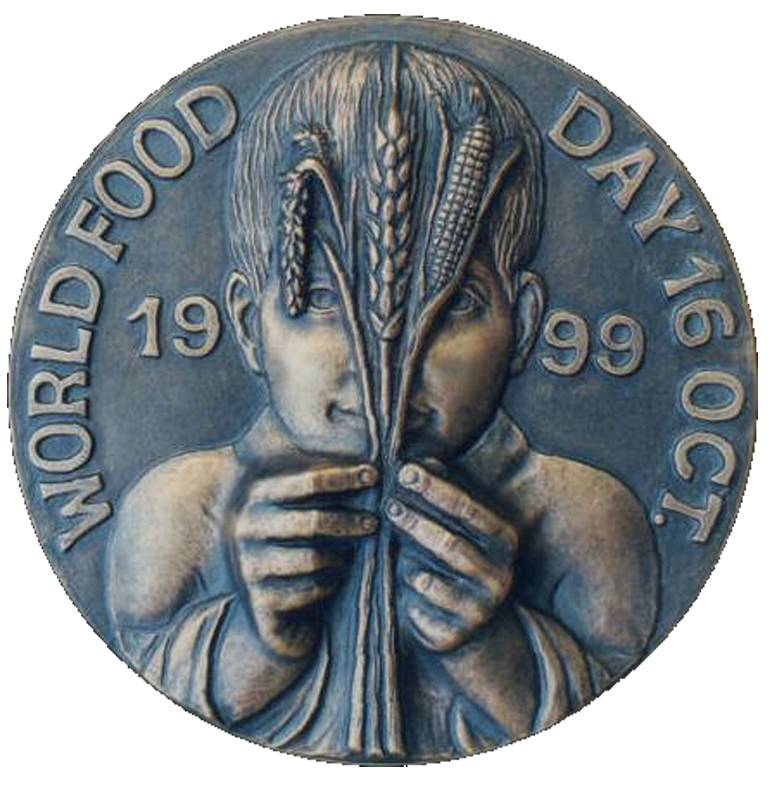 Recto di medaglia in bronzo coniato, realizzata per la Giornata Mondiale dell’Alimentazione. Committente: F.A.O. Food and Agriculture Organization of the United Nations, 1999