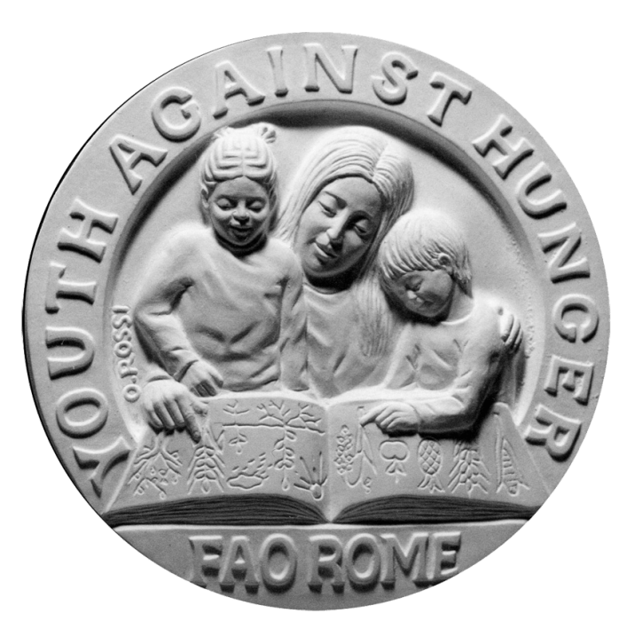 Verso di modello in gesso per la medaglia di bronzo coniato, realizzata in occasione della Giornata Mondiale dell’Alimentazione. Committente: F.A.O. Food and Agriculture Organization of the United Nations, 1999