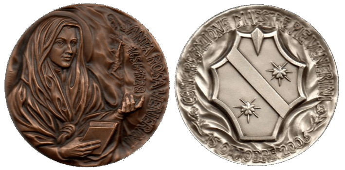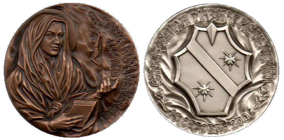 Recto/verso di medaglie in bronzo e argento coniato, realizzate in occasione della canonizazzione di Santa Rosa Venerini. Committente: ditta privata, 2006
